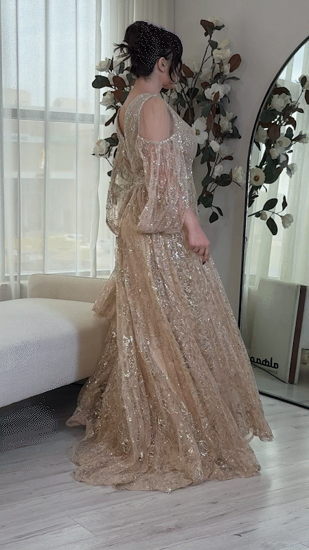 هذا الفستان مصنوع من قماش الدانتيل الفاخر.الفستان مطرز بالكامل بتطريز لامع يعكس الإضاءة بشكل جميل.يتميز بلونه الذهبي الأنيق وتصميمه العصري.يجمع بين ال..