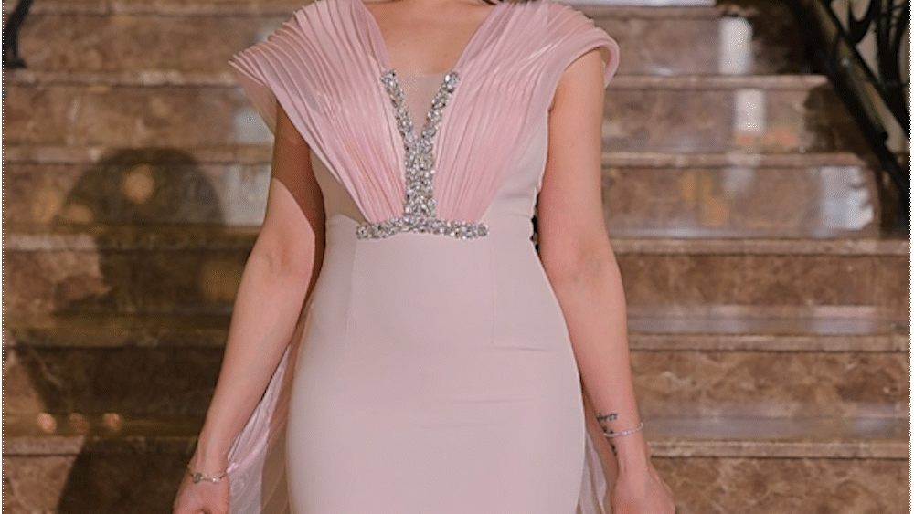 فستان أنيق ومترف باللون الوردي الفاتح، يتميز بقماشه اللامع وتصميمه الفريد الذي يدمج بين الأناقة والرقي. الجزء العلوي مزود بوشاح منسدل على الأكتاف يُشب..